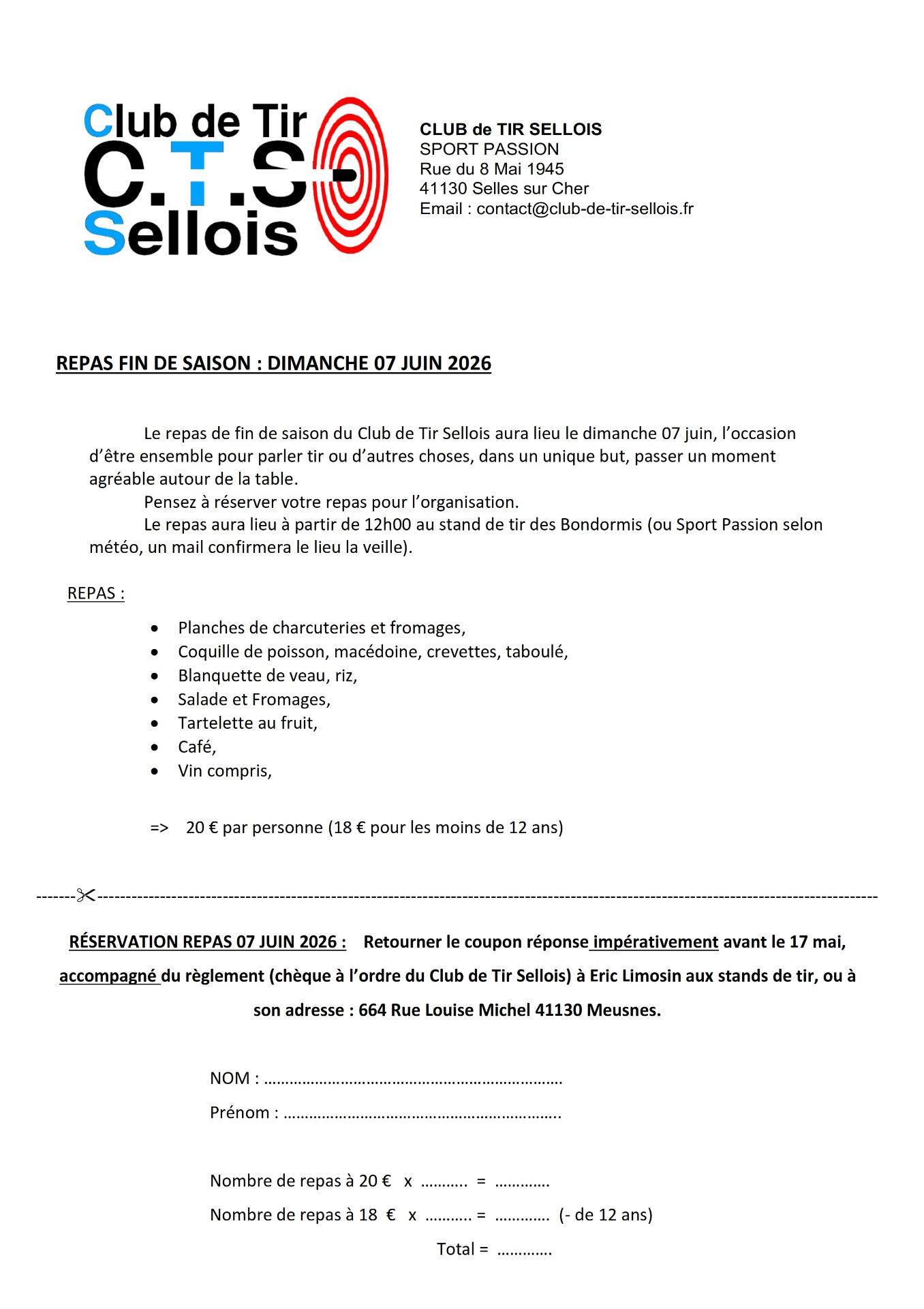 Le repas de fin de saison du Club de Tir Sellois aura lieu le dimanche 07 juin 2026 (et non 2025 comme dans le mail !), l'occasion d'être ensemble pour parler tir ou d'autres choses, dans un unique but, passer un moment agréable autour de la table.